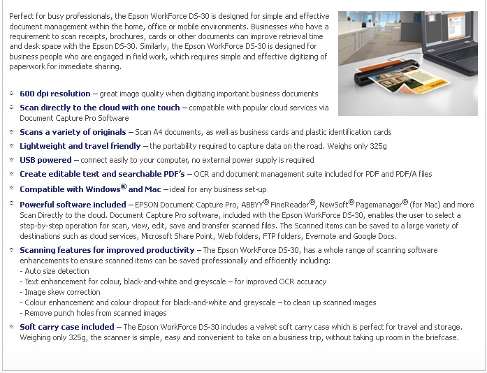 Perfect for busy professionals, the Epson WorkForce DS-30 is designed for simple and effective document management within the home, office or mobile environments